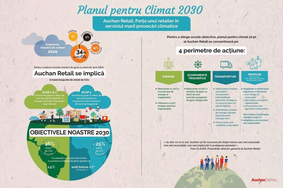 În 2022, angajamentul Auchan față de climat s-a accelerat și mai mult, odată cu definirea unei strategii globale pentru toate țările în care Auchan Retail este prezent. Astfel, compania și-a definit la nivel de grup o strategie care abordează problema schimbărilor climatice sub numele de Planul pentru Climat 2030, ce vizează reducerea emisiilor de gaze cu efect de seră în concordanță cu prevederile Acordului de la Paris de limitare a încălzirii globale. Strategia de decarbonizare se concentrează pe 4 perimetre de acțiune: energie, echipamente frigorifice, transporturi și produse.