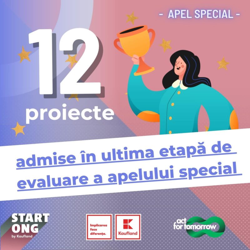 12 proiecte ONG, din cele 30 semifinaliste, au ajuns în finala apelului special de proiecte inovatoare din cadrul programului Start ONG, lansat de Kaufland Romania și implementat de Asociația Act for Tomorrow.