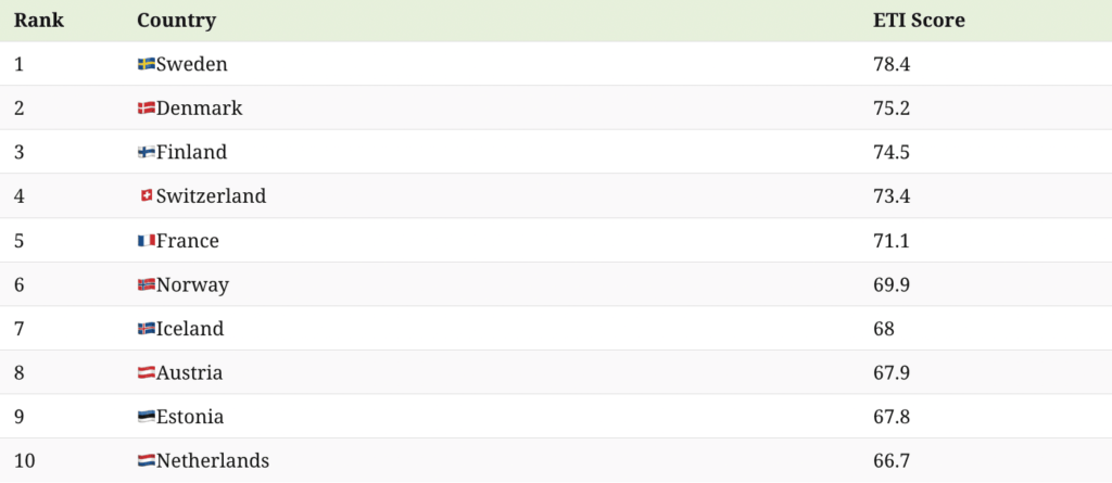 Graficul de mai jos, creat de publicația Visual Capitalist în parteneriat cu National Public Utilities Council, arată primele 10 și ultimele 10 țări în funcție de scorurile lor ETI.