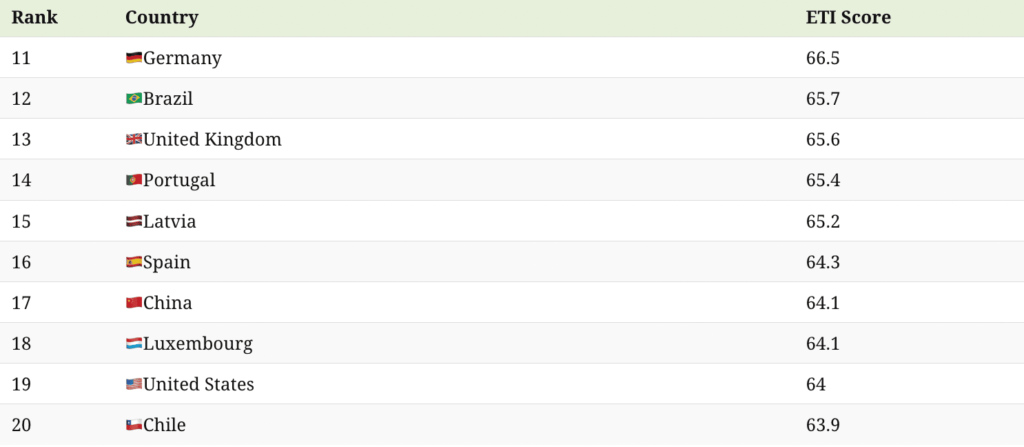Cea mai mare economie a lumii, Statele Unite, a rămas la 64,0 în ultimul an. În schimb China a avansat la 64,1 din 2023 până în 2024, datorită creșterii semnificative în domenii precum bateriile, vehiculele electrice și liniilor de transmisie de înaltă tensiune. Țara alocă, de asemenea, cea mai mare parte din PIB-ul său investițiilor în surse regenerabile, cu 9 %.