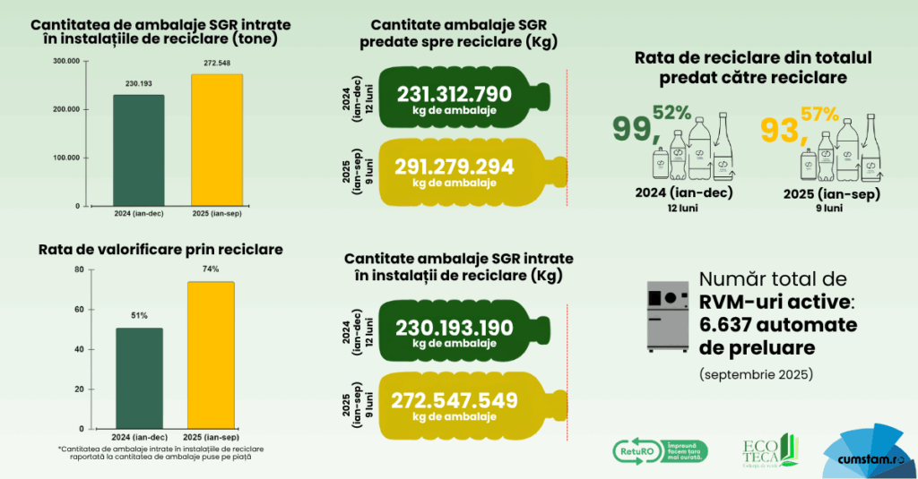 Cantitățile de materiale – PET, sticlă și aluminiu – care au intrat efectiv în instalațiile de reciclare au crescut de la aproximativ 230.000 de tone în întregul an 2024 la peste 270.000 de tone în perioada ianuarie – septembrie 2025.