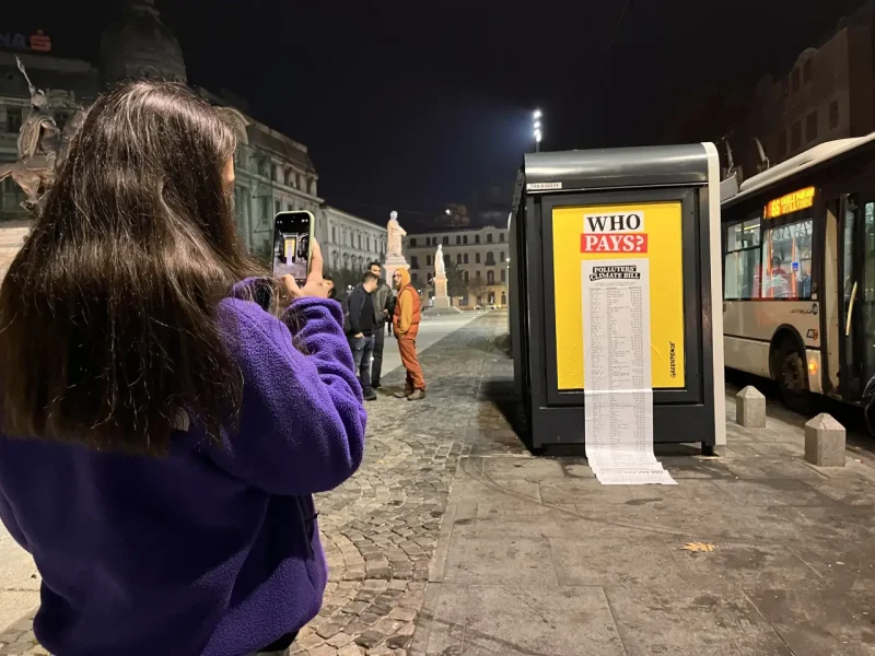 Spațiile publicitare din stațiile de autobuz de la Petrom City, Universitate, Piața Romană și Piața Victoriei au fost acoperite cu materiale care prezentau o „factură climatică”. Mesajul transmis făcea referire la costurile pe care cetățenii le suportă în contextul fenomenelor meteorologice extreme, precum inundații, secete, incendii și valuri de căldură.