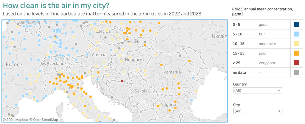Vizualizatorul de calitate a aerului din orașele europene al AEE clasifică 375 de orașe, de la cel mai curat la cel mai poluat, pe baza nivelurilor medii de particule fine (PM2,5). Datele au fost colectate de la peste 500 de stații de monitorizare din locații urbane din țările membre ale SEE în ultimii doi ani calendaristici, 2022 și 2023.