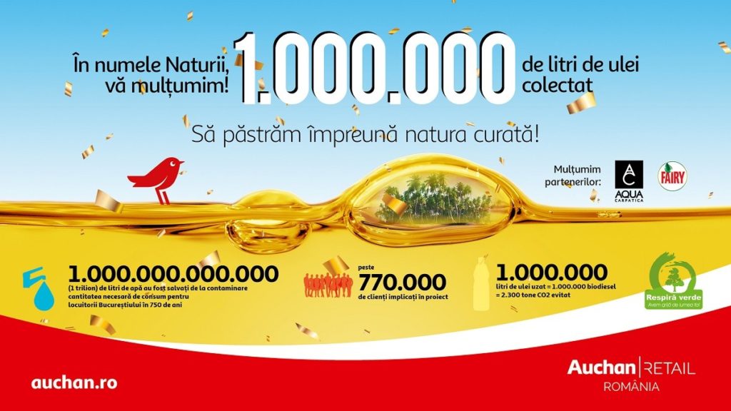 „Am asistat la o creștere organică a cantității de ulei aduse de consumatori pentru colectare, ajungând astăzi la 1 milion de litri colectați la nivelul întregii rețele, cantitate care nu va mai ajunge necontrolat în natură, poluând solul și apele. Suntem recunoscători tuturor clienților care s-au implicat și au dat dovadă de responsabilitate, înțelegând că un gest simplu devine vital atunci când vorbim despre protejarea planetei și a resurselor, iar împreună ne putem bucura de un mediu mai curat. De asemenea, mulțumim partenerilor noștri, Fairy, Aqua Carpatica, Respiră Verde, precum și echipelor implicate, alături de care vom continua să luptăm pentru un viitor mai verde, și îi invităm pe români să aducă în continuare uleiul uzat în magazinele noastre pentru reciclare” a declarat Corina Dospinoiu, Director Sustenabilitate Auchan Retail România.