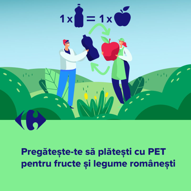 Carrefour România relansează pe 22 septembrie Plata cu PET în 20 de hipermarketuri din țară. La fel ca în edițiile anterioare, pentru fiecare PET colectat, clienții Carrefour primesc un fruct sau o legumă cultivate în România, iar de anul acesta, același mecanism este aplicat şi pentru dozele de aluminiu și sticle. Mai mult, pentru fiecare sticlă de apă rPET DORNA (produsă din plastic 100% reciclat și 100% reciclabil), clienții vor primi o cantitate dublă de fructe și legume. În acest fel, românii vor putea contribui la reducerea amprentei asupra mediului și la susținerea producătorilor locali.
