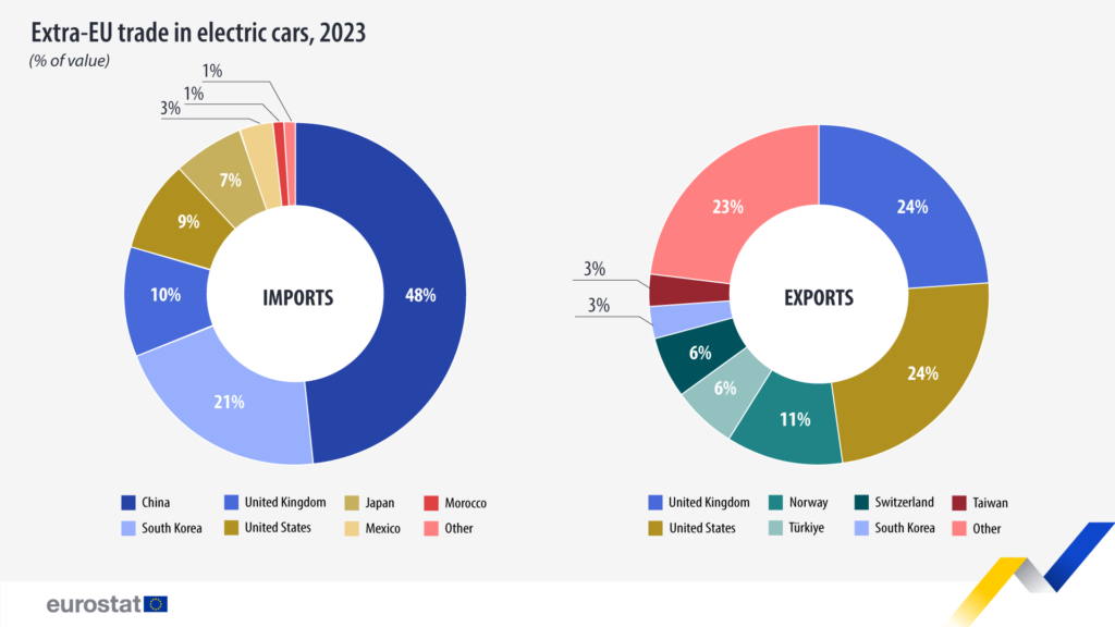 Primele 3 țări extra-UE din care UE a importat mașini electrice au fost China, cu 9,7 miliarde EUR (reprezentând 48% din importurile totale de mașini electrice), urmată de Coreea de Sud (4,3 miliarde EUR), cu o cotă procentuală de 21%, și Regatul Unit (2,1 miliarde EUR), cu o cotă de 10%. Primele 3 țări extracomunitare principale pentru exporturi au fost Regatul Unit și Statele Unite, cu o cotă de 24% fiecare (7,1 miliarde EUR și, respectiv, 6,9 miliarde EUR), urmate de Norvegia cu 11% (3,1 miliarde EUR).