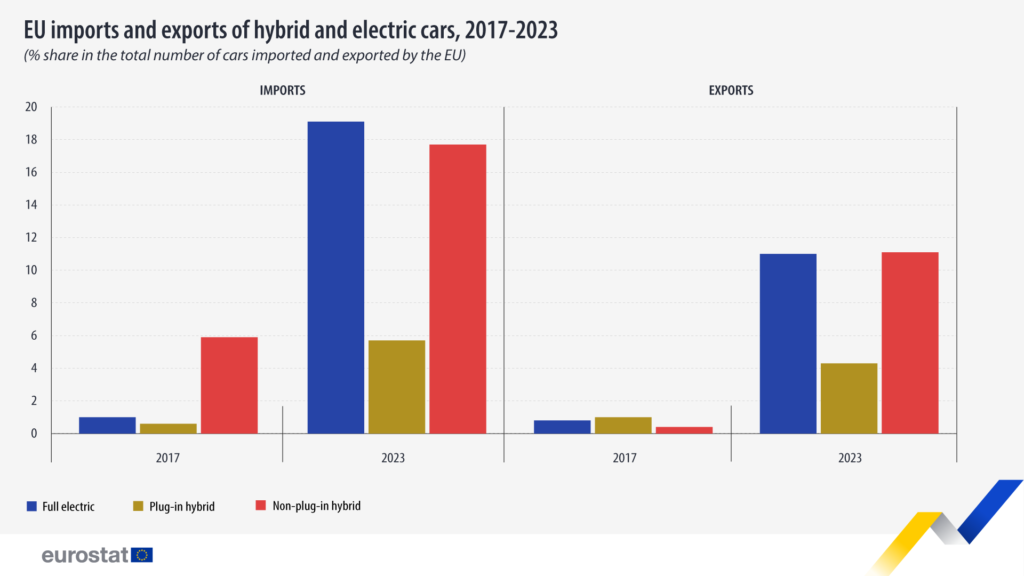 Între 2017 și 2023, comerțul UE cu mașini electrice și hibride a crescut substanțial, potrivit statisticilor Eurostat. În 2023, aproape 43% din numărul total de automobile importate în UE erau electrice sau hibride, ceea ce indică o creștere semnificativă în comparație cu ponderea observată în 2017, care a fost de 8%. Exporturile UE au sărit de la 2% din numărul total de mașini exportate în 2017, la 26% din total în 2023 (creștere de +24 puncte procentuale – pp).