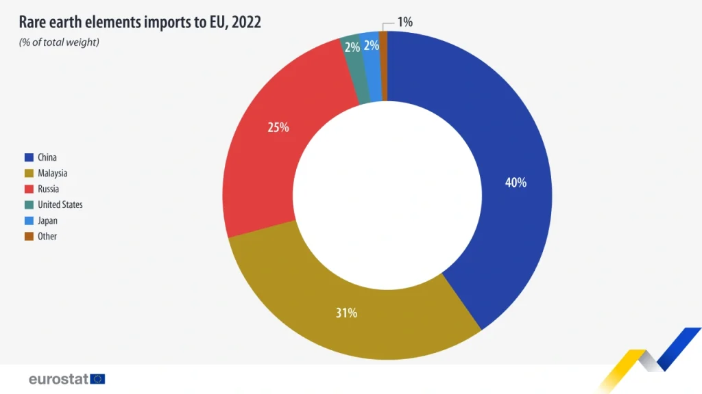 China a fost cel mai mare partener pentru importurile de pământuri rare, reprezentând 40 % din greutatea totală a importurilor, adică 7,4 mii de tone. Aceasta a fost urmată de Malaysia, care a contribuit cu 31 % din importuri, adică 5,6 mii de tone, și de Rusia, cu 25 % din importuri, sau 4,5 mii de tone.