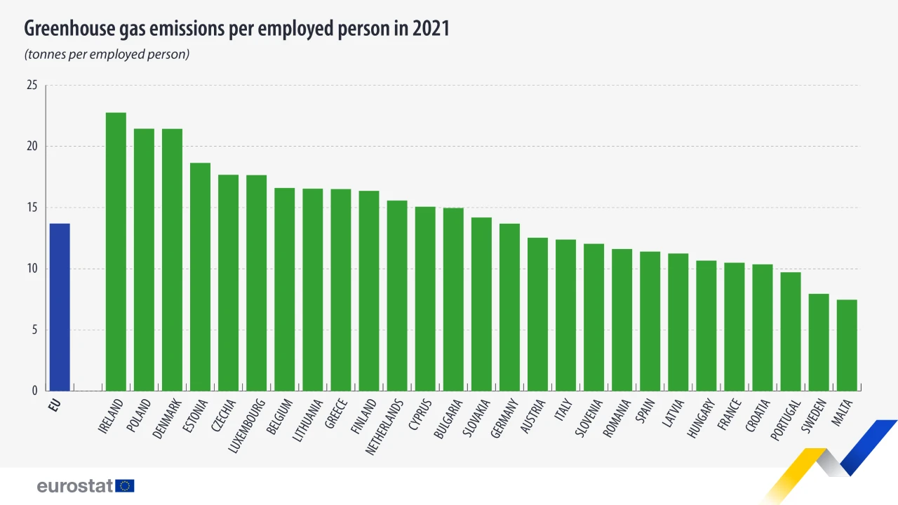 Cele mai mari emisii pe persoană angajată au fost înregistrate în Irlanda (22,8 tone pe persoană angajată), Polonia și Danemarca (ambele cu 21,4 tone).