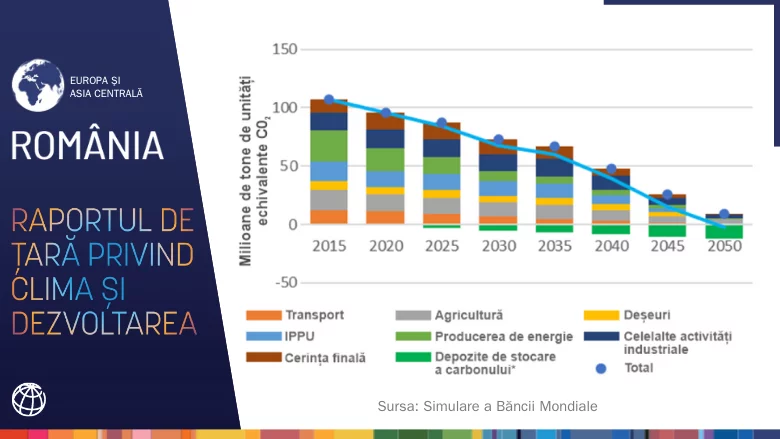 Raportul analizează modul în care acțiunea climatică, în conformitate cu obiectivul României de a atinge zero emisii nete până în 2050, interacționează cu traiectoria de creștere economică și dezvoltare a țării și propune o serie de acțiuni prioritare pentru reducerea emisiilor de carbon și creșterea rezilienței, sprijinind în același timp creșterea economică incluzivă și reducerea sărăciei.