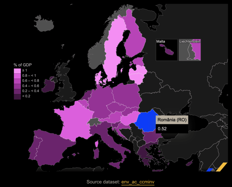 Conform celor mai recente date Eurostat, investițiile private în combaterea schimbărilor climatice la nivelul Uniunii Europene au atins 95,3 miliarde de euro în 2023, reprezentând 0,55% din PIB-ul comunitar. Această cifră marchează o ușoară scădere față de vârful de 0,64% înregistrat în 2021, însă se menține peste media istorică.