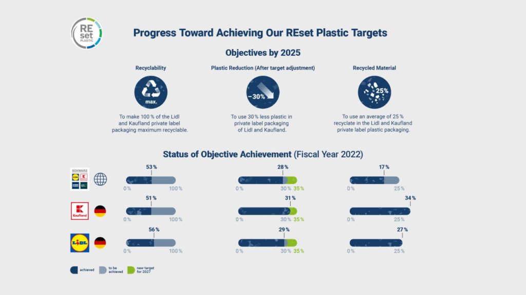 Companiile din grupul Schwarz, Kaufland și Lidl, și-au depășit deja obiectivul inițial de a utiliza cu 20% mai puțin plastic până în 2025 în toate țările, stabilindu-și un nou obiectiv, mai ambițios: utilizarea cu 30% mai puțin plastic până în 2025 și cu 35% până în 2027 în ambalajele de plastic ale produselor marca proprie, comparativ cu anul de referință 2017.