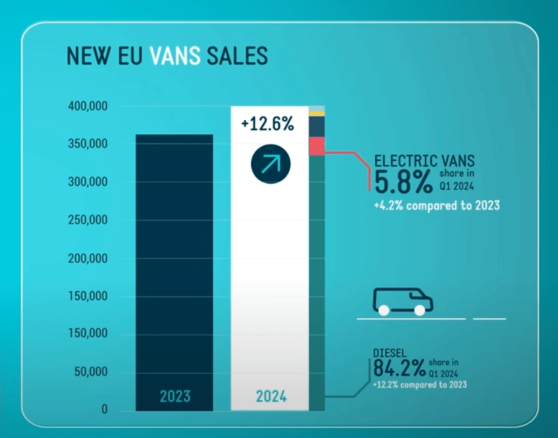 În primul trimestru al anului 2024, piața vehiculelor comerciale (CV) din UE a înregistrat rezultate mixte, dar vânzările de furgonete, camioane și autobuze cu încărcare electrică au crescut toate.