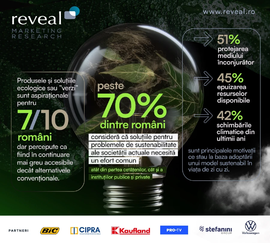 Rezultatele barometrului realizat de Reveal Marketing Research în colaborare cu BIC, Asociația CIPRA, Kaufland România, Pro Tv, Stefanini Group și Volkswagen România, arată că dimensiunea ecologică a sustenabilității primează în percepțiile românilor, într-o măsură semnificativ mai mare decât implicațiile sociale sau cele economice.