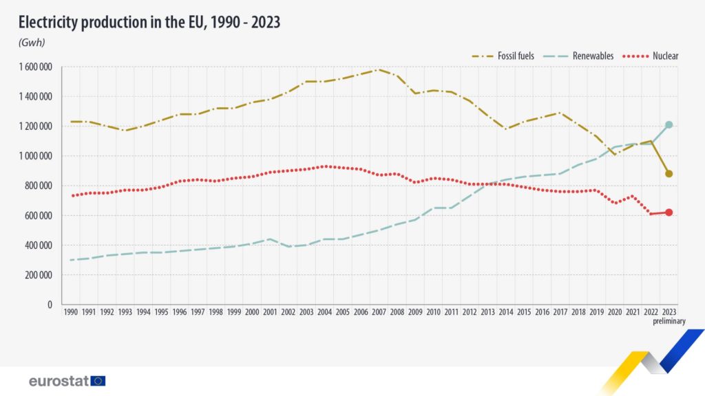 În 2023, energia regenerabilă a fost principala sursă de energie electrică în UE, reprezentând 44,7% din totalul producției de energie electrică. Energiile regenerabile au generat 1,21 milioane de gigawați-oră (GWh), marcând o creștere de 12,4% față de 2022.