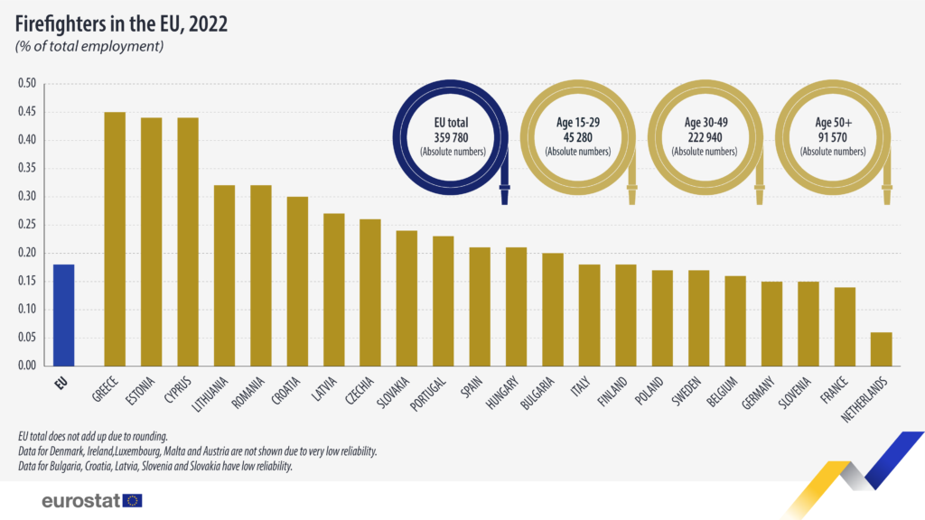 Dintre țările UE pentru care sunt disponibile date verificabile, Grecia, Estonia, Cipru, Lituania și România au înregistrat cea mai mare pondere a pompierilor în ocuparea forței de muncă la nivel național, cu ponderi de peste 0,3%, în timp ce Țările de Jos și Franța au avut cele mai mici ponderi, de aproximativ 0,1%.
