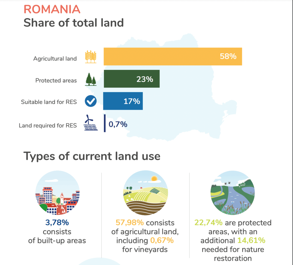 Terenuri adecvate suficiente: Potrivit Centrului Comun de Cercetare (JRC), 5,2% din terenurile UE pot fi considerate „adecvate” pentru dezvoltarea energiei solare și eoliene, pe baza unor criterii agricole, de mediu și tehnice stricte pentru găzduirea proiectelor eoliene și solare terestre.