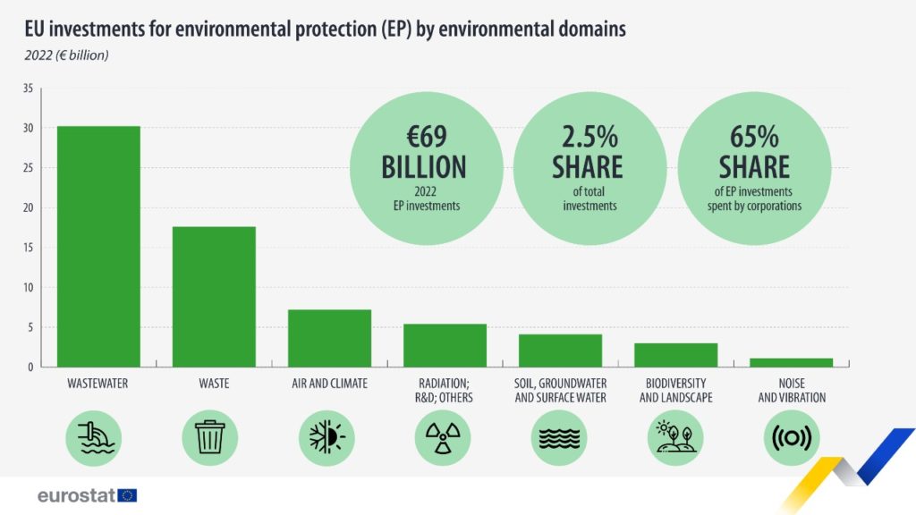 Cea mai mare parte a investițiilor s-a concentrat pe serviciile de gestionare a apelor uzate și a deșeurilor. În 2022, acestea au reprezentat 44,0% și, respectiv, 25,7% din totalul investițiilor pentru protecția mediului, în timp ce 10,5% au fost destinate protecției aerului, 7,8% protecției împotriva radiațiilor, cercetării și dezvoltării mediului și altor activități de protecție a mediului, inclusiv administrației generale de mediu și educației, 6,0% protecției solului și apelor subterane, 4,4% biodiversității și conservării peisajelor, iar restul de 1,6% reducerii zgomotului.