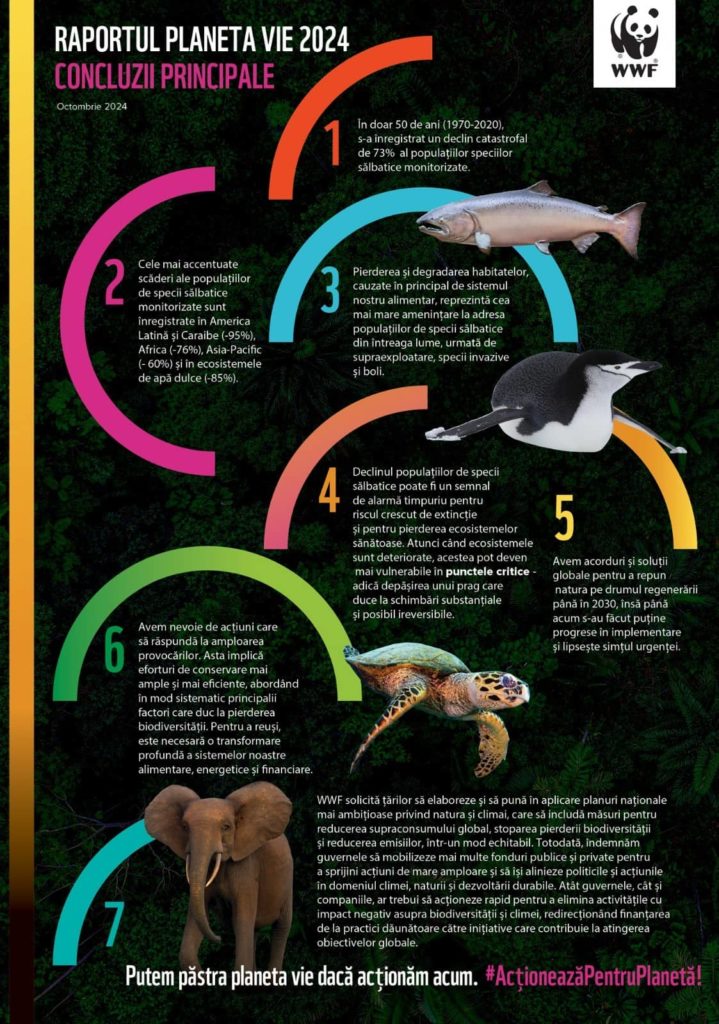 - Următorii cinci ani sunt decisivi pentru viața pe Pământ. Populațiile de specii sălbatice au avut un declin catastrofal de 73% în doar 50 de ani, fiind atins cel mai ridicat nivel al degradării naturii, potrivit Raportului Planeta Vie 2024, publicat de WWF